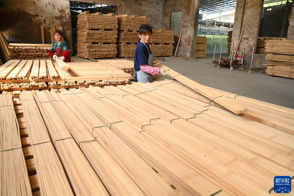 8月9日,建甌市恒順炭業有限公司工人在整理用來制作竹家居工藝品的竹條。