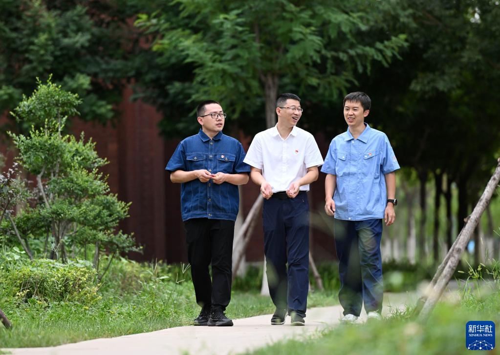 王興東(中)、許超(右)和劉世雄在校園內交談(8月8日攝)。新華社記者 趙子碩 攝