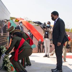 8月10日,在贊比亞盧薩卡省瓊圭地區的坦贊鐵路紀念園,贊比亞總統希奇萊馬(前右)向為修建坦贊鐵路等項目而犧牲的中方人員敬獻花圈。