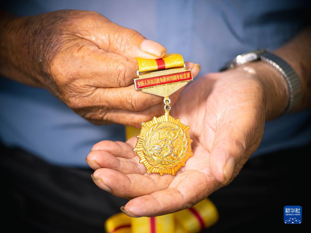 7月27日,在浙江省溫嶺市,抗戰(zhàn)老戰(zhàn)士牟錫志展示紀(jì)念章。