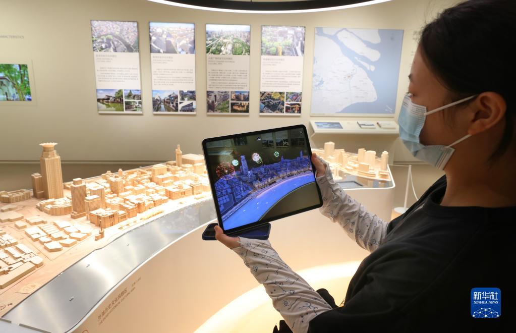 8月11日,一位參觀者在上海城市規劃展示館體驗增強現實技術(AR)觀看城市建筑模型沙盤。
