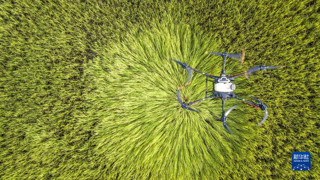 8月1日,大疆農業植保無人機在泰國黎逸府噴灑農藥(無人機拍攝)。