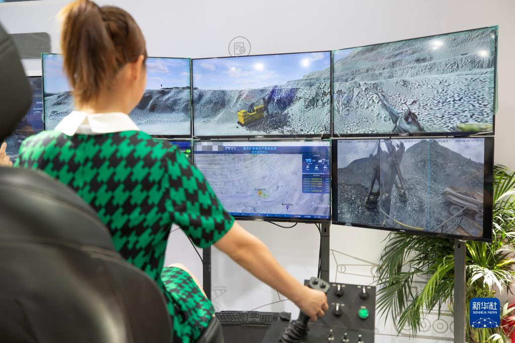 8月11日,在2022世界5G大會展廳里,參觀者體驗5G網絡支持下的遠程挖礦設備。