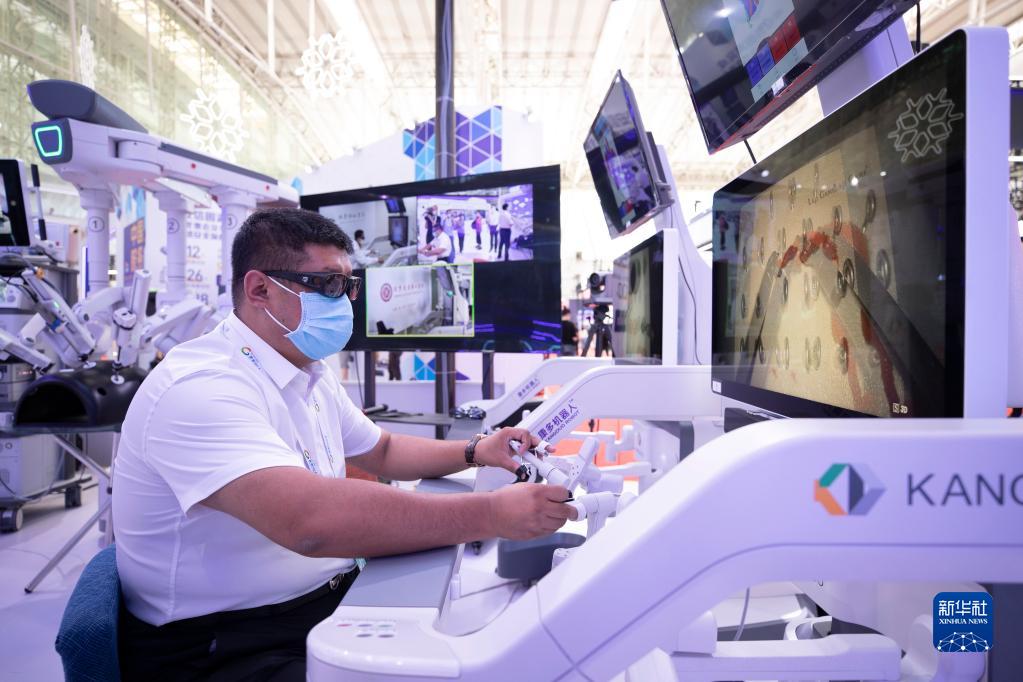 8月11日,在2022世界5G大會展廳里,參展商演示5G網絡支持下的遠程手術設備。
