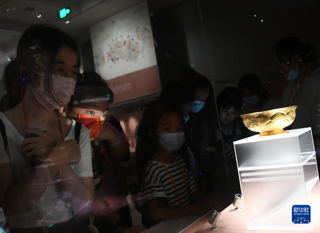 8月11日,游客在陜西歷史博物館何家村窖藏出土文物展上參觀鴛鴦蓮瓣紋金碗。
