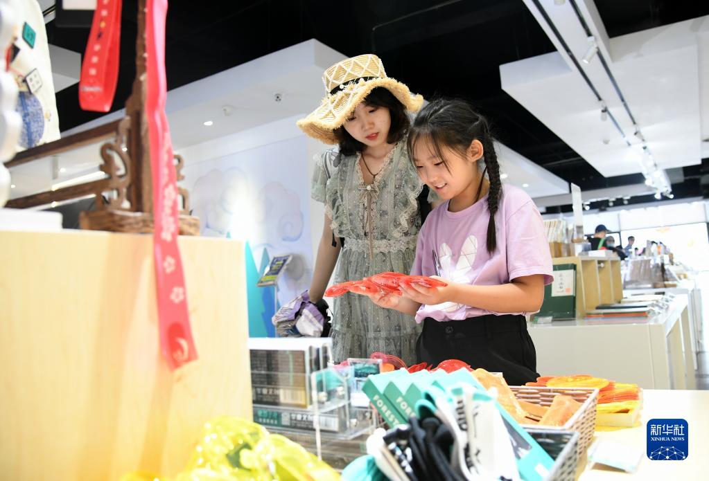 8月11日,一位小朋友和家長在陜西歷史博物館文創(chuàng)商店挑選文創(chuàng)類商品。