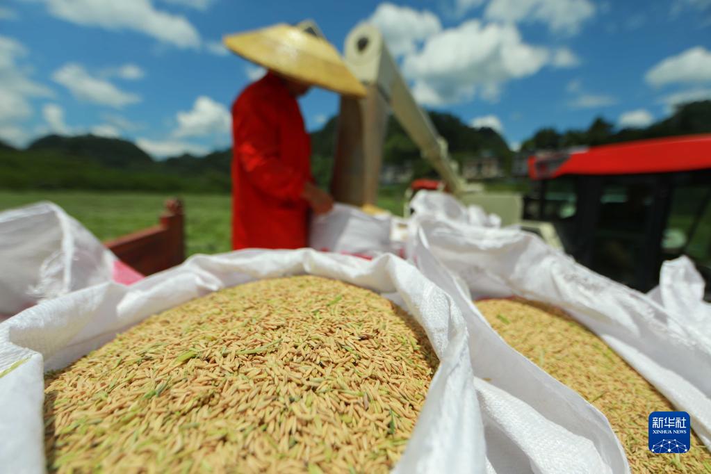 8月11日,村民在貴州省黔東南苗族侗族自治州岑鞏縣注溪鎮周坪村雜交水稻制種基地將采收的種稻裝袋。