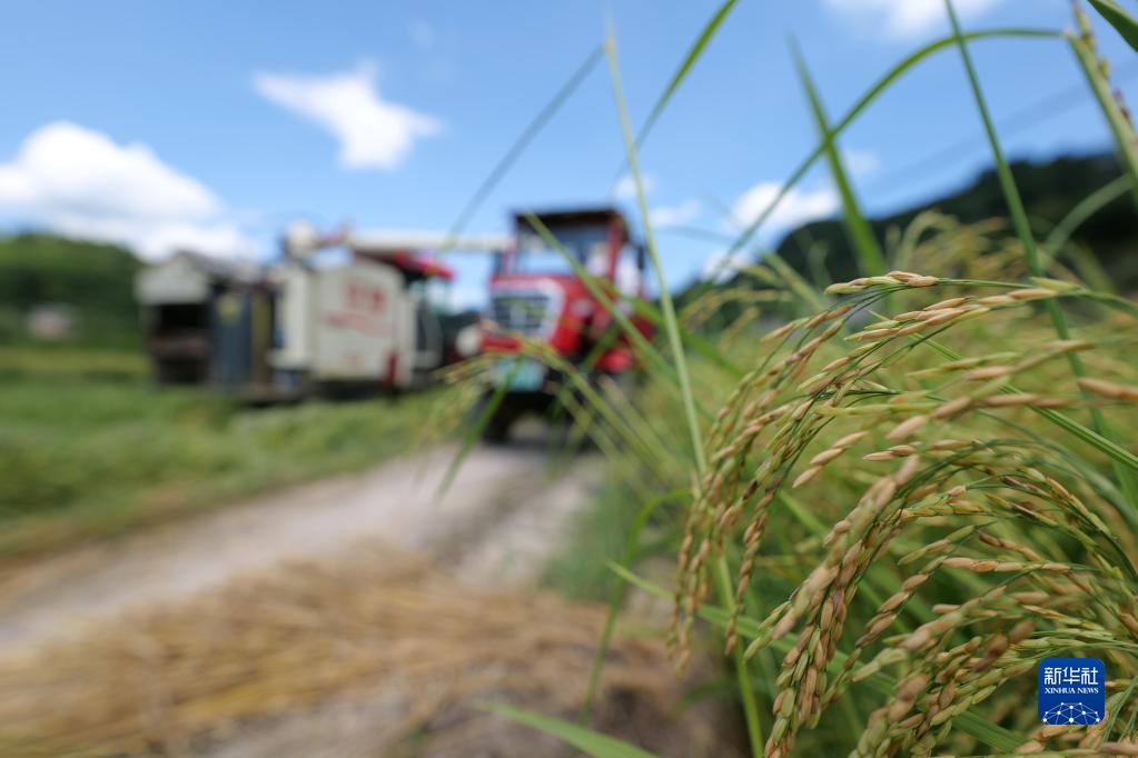 8月11日,農(nóng)技人員在貴州省黔東南苗族侗族自治州岑鞏縣注溪鎮(zhèn)周坪村雜交水稻制種基地采收種稻。