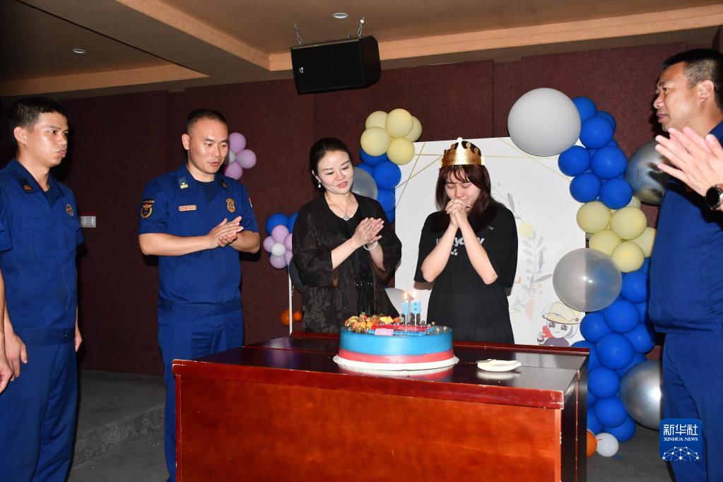 萍鄉(xiāng)市消防救援支隊(duì)的消防員們?yōu)樘占鸯希ㄓ叶c祝18歲生日(7月11日攝)。