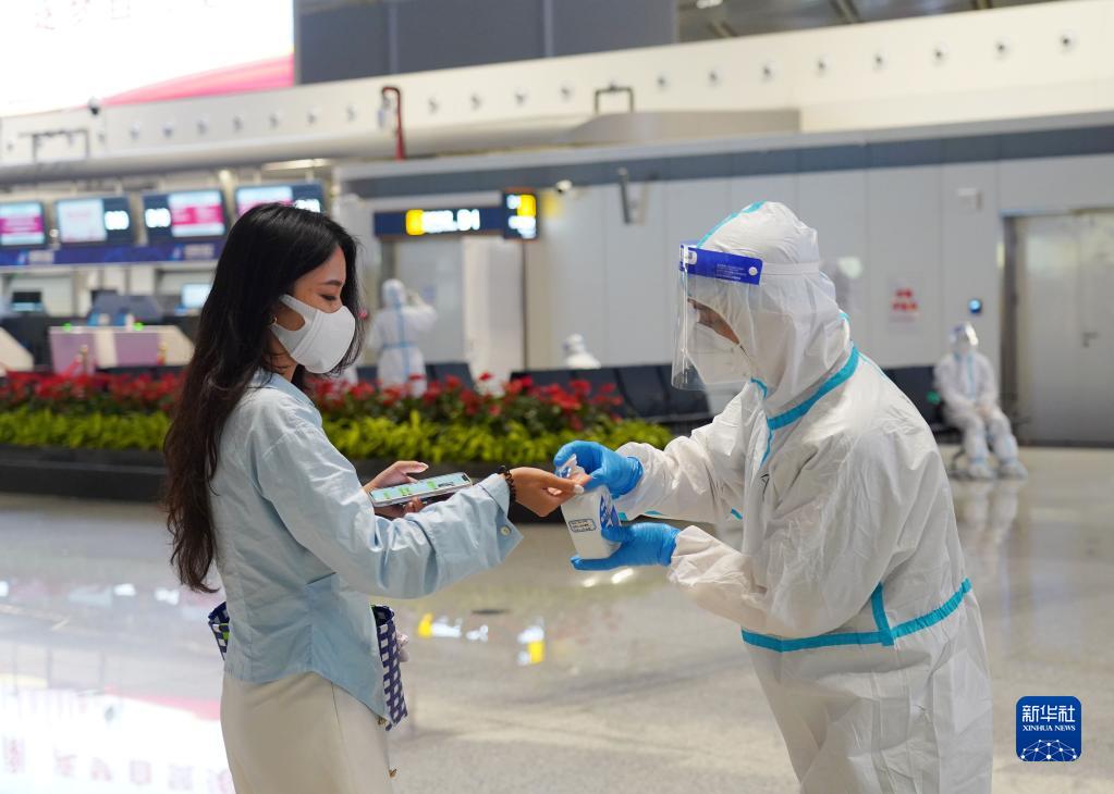 8月11日,機(jī)場工作人員對(duì)旅客進(jìn)行手部消毒。
