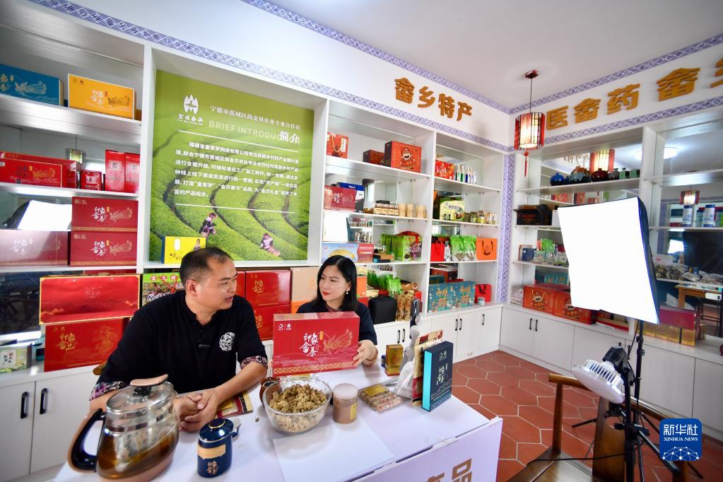 在福建省寧德市蕉城區(qū)金涵鄉(xiāng)上金貝村的直播間,上金貝村黨支部書記蘭春華(左)在與主播向網(wǎng)友推介家鄉(xiāng)特產(chǎn)(8月11日攝)。