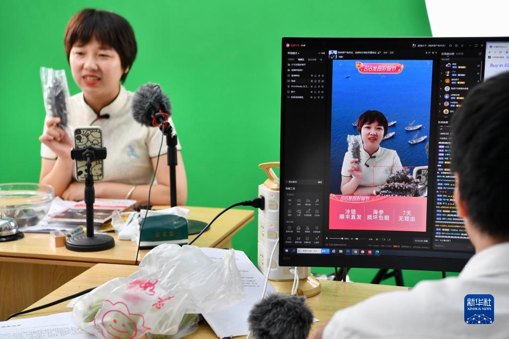 主播在福建省霞浦縣“趕海父子”直播間介紹當(dāng)?shù)厥a(chǎn)的海參(8月10日攝)。