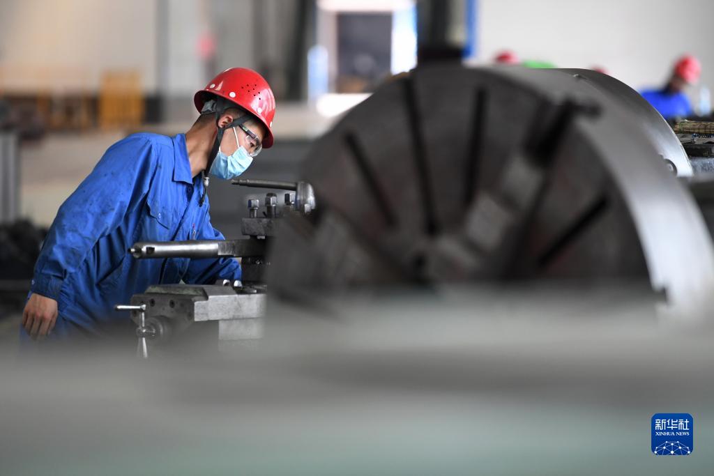 工人在蘭州新區(qū)蘭石集團高端裝備產(chǎn)業(yè)園車間內(nèi)作業(yè)(8月11日攝)。