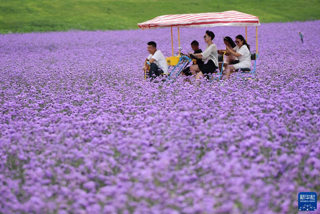 游客在蘭州新區臨港花海游玩(8月10日攝)。