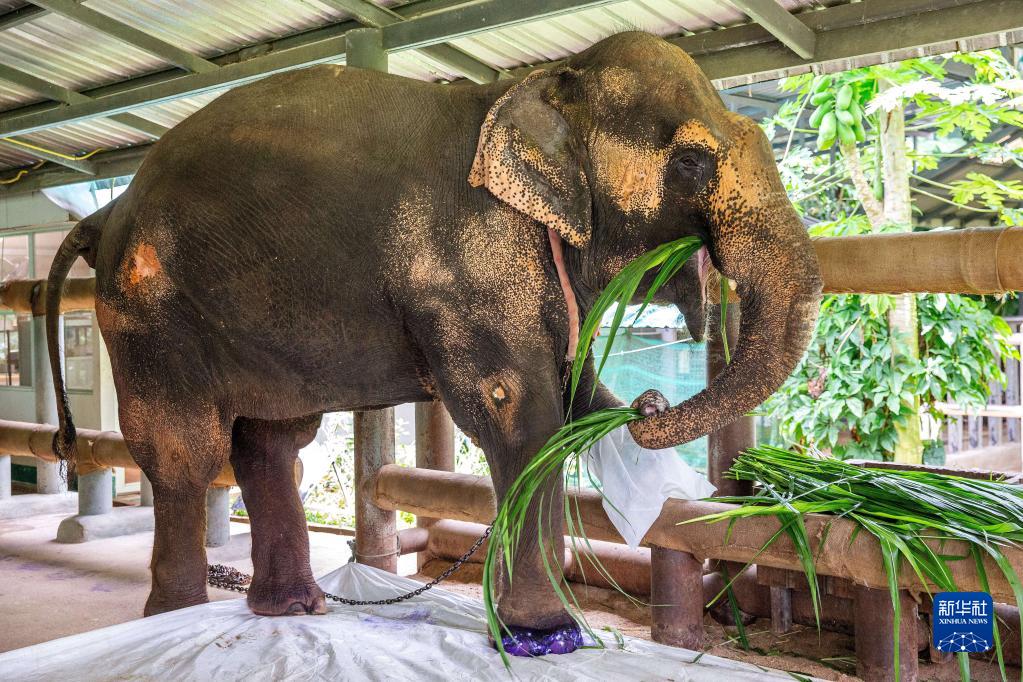 8月6日,在泰國南邦府“亞洲象之友”大象醫(yī)院,一頭受傷的大象在進(jìn)食。