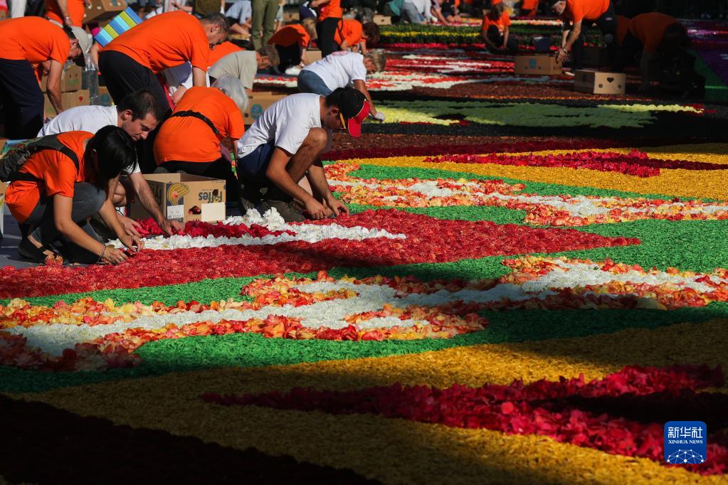 8月12日,工作人員在比利時布魯塞爾大廣場鋪裝“鮮花地毯”。
