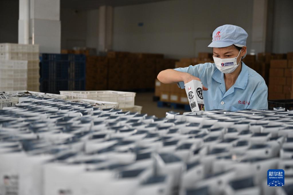 8月12日,在連江縣一家海帶食品加工企業車間,工人打包袋裝食品。