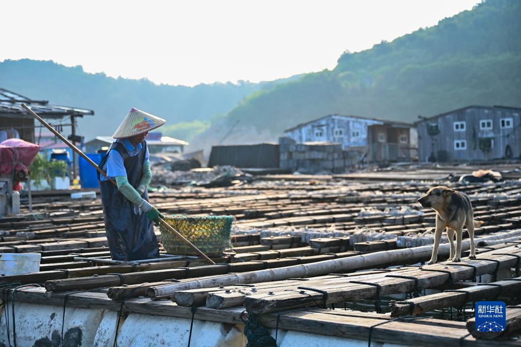 8月12日,連江縣苔菉鎮東洛村村民在漁排上養殖鮑魚。在連江縣苔菉鎮東洛村,當地鮑魚加工企業收購村民養殖的鮑魚,并為鄉鎮投資打造深海鮑魚機械化養殖平臺,實現傳統養殖業向深遠海、智能化發展。