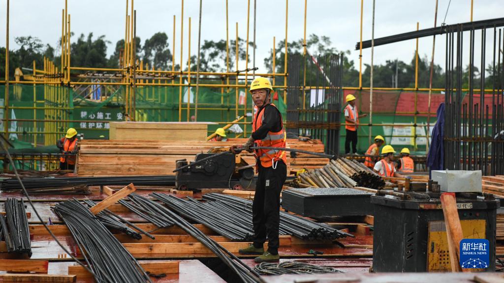 在南玉高鐵玉林北站工地,工人在搬運(yùn)鋼筋(8月12日攝)。