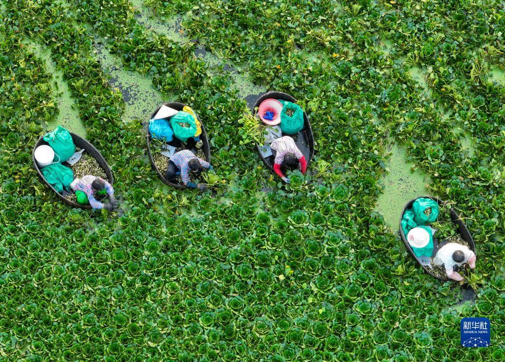 8月13日,江蘇省泰州市姜堰區淤溪鎮卞莊村村民采摘菱角(無人機照片)。