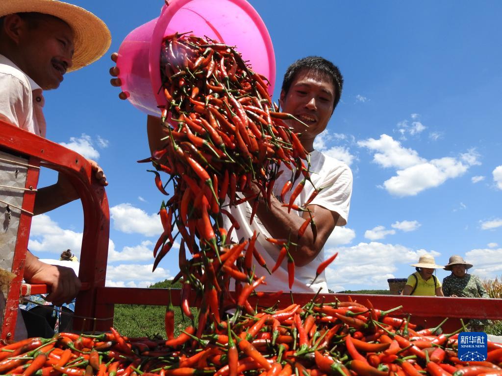 8月12日,四川省達(dá)州市大竹縣八渡鄉(xiāng)花巖村村民在收獲辣椒。