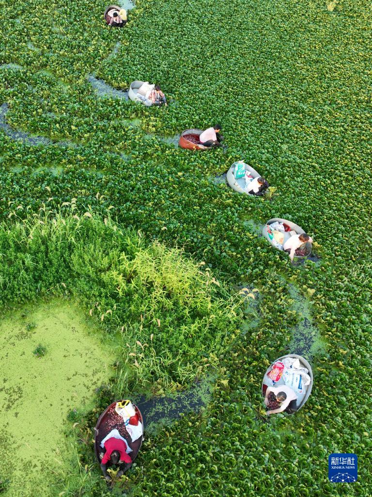 8月13日,在江蘇省淮安市洪澤區岔河鎮,農民采收紅菱(無人機照片)。