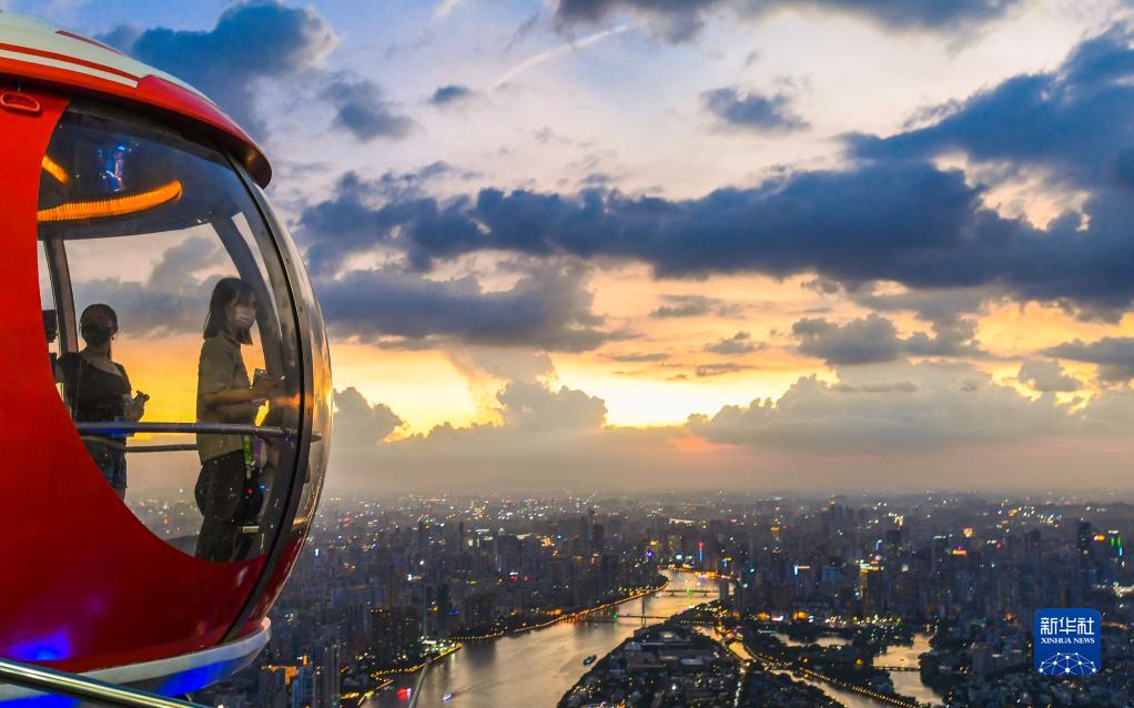 游客在廣州塔頂的戶外平臺上體驗摩天輪,觀賞城市落日。廣州塔是廣州城市新地標、潮流打卡地(8月7日攝)。