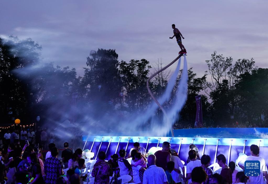 8月13日,工作人員在建德市楊村橋鎮十里埠黃金水岸國際濱水公園進行水上飛人表演。