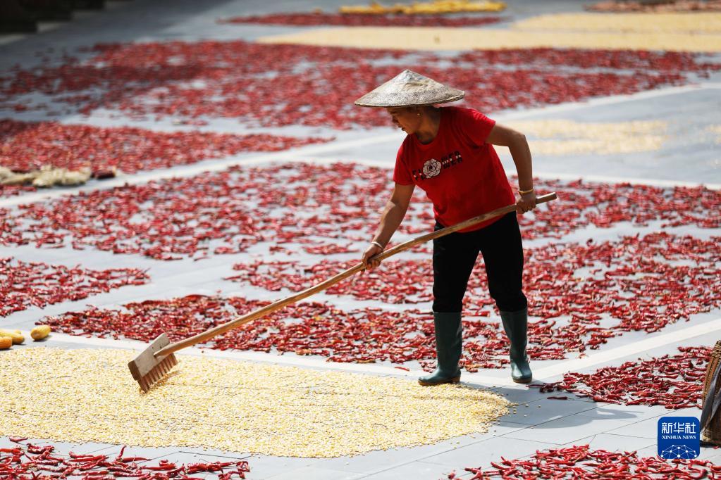 立秋過后,貴州高原鄉(xiāng)村處處曬秋忙。玉米、辣椒、稻谷、黃豆等農(nóng)作物晾曬在農(nóng)家房前屋后,與周圍別具特色的田園風光融為一體,繪就出一幅幅美麗的豐收圖景。