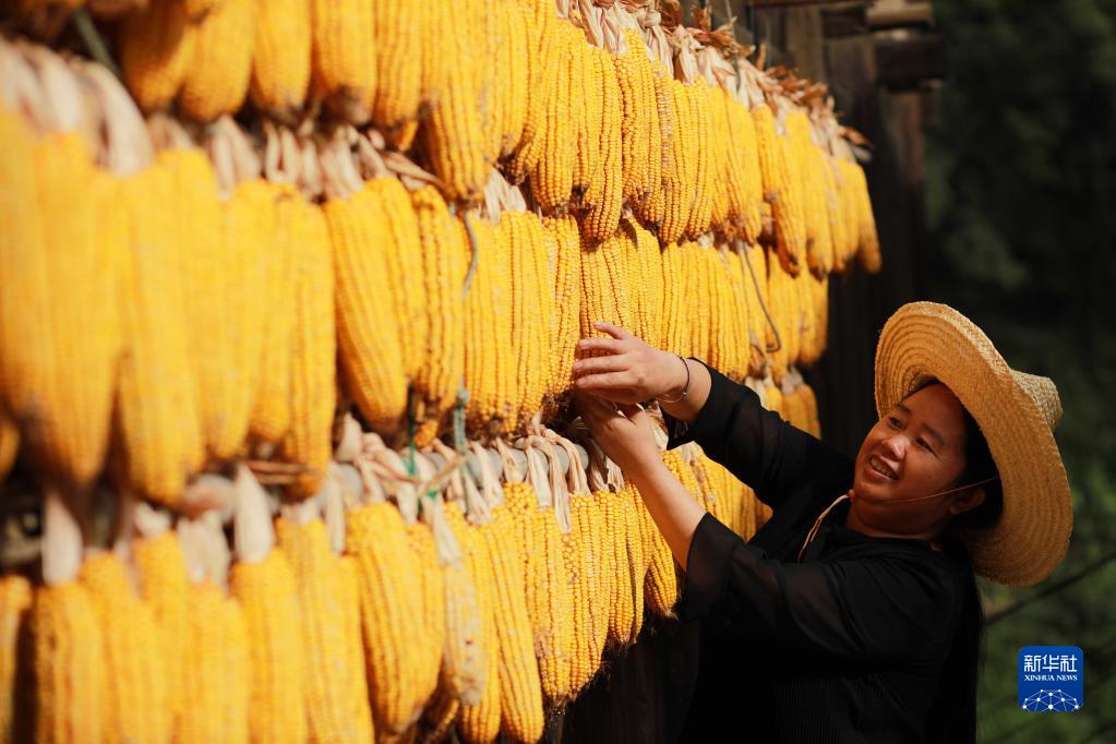 8月14日,村民在貴州省黔東南苗族侗族自治州劍河縣久仰鎮(zhèn)基佑村晾曬玉米。