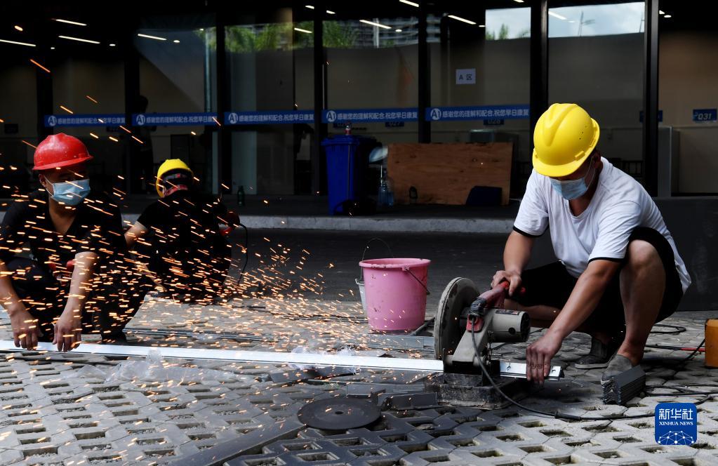 8月14日,工人在三亞第三方艙醫(yī)院作業(yè)。