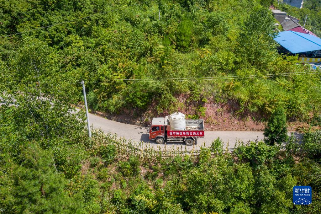 8月13日,在重慶市巫山縣騾坪鎮騾坪村,送水車行駛在山路上(無人機照片)。