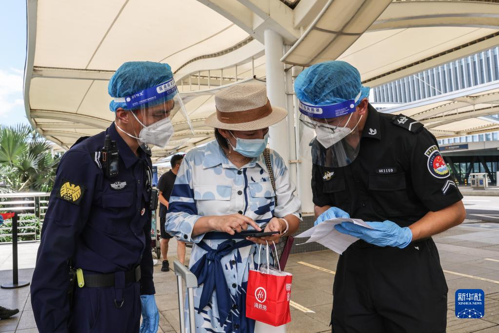 8月14日,海口美蘭機場的工作人員查驗旅客的核酸信息。