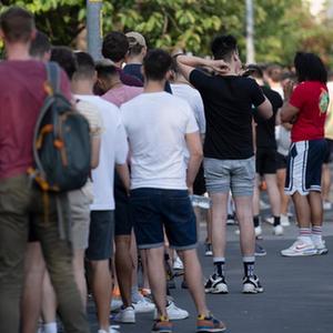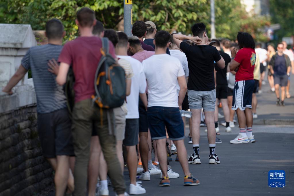 8月14日,人們在英國曼徹斯特一處猴痘疫苗接種點外排隊等待接種疫苗。
