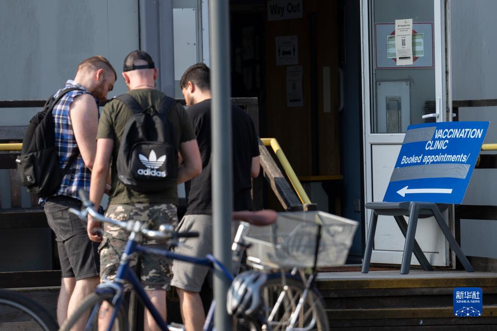8月14日,人們在英國曼徹斯特一處猴痘疫苗接種點外排隊等待接種疫苗。