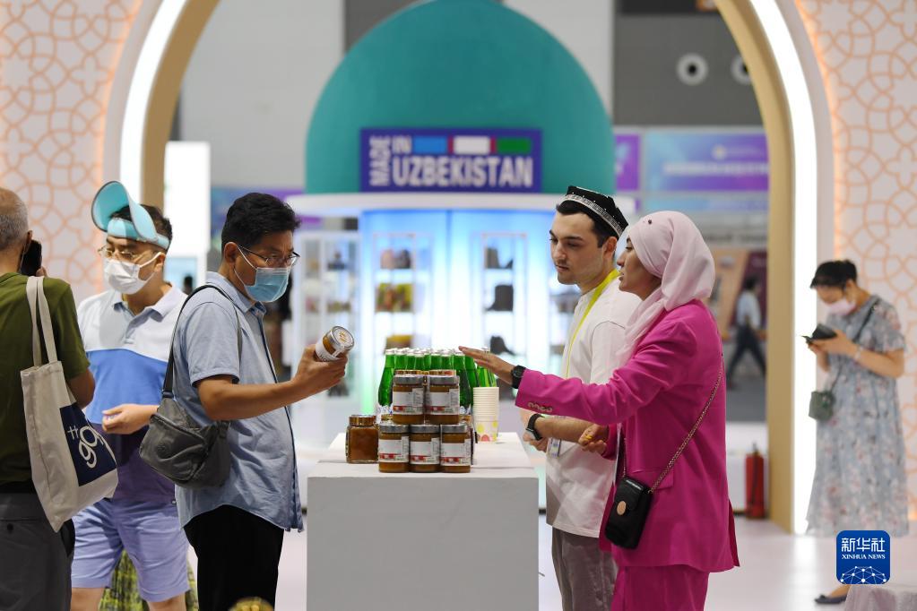 8月14日,參觀者在第六屆絲綢之路國際博覽會主賓國烏茲別克斯坦展區上了解當地特色商品。