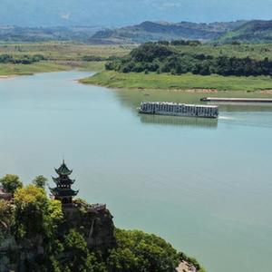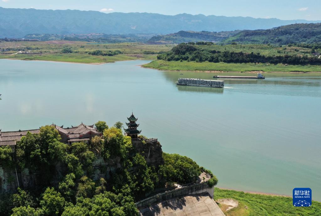 滿載貨物的滾裝貨船民快輪駛過重慶市忠縣石寶寨(8月8日攝,無人機照片)。