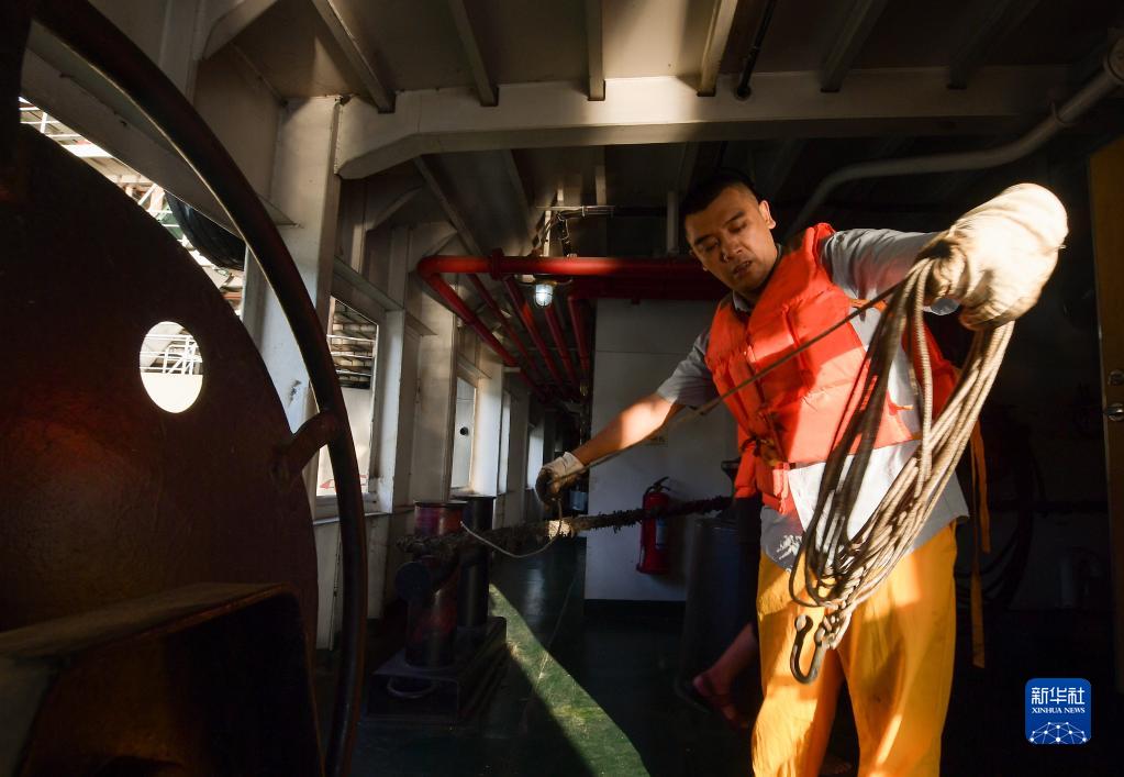 離泊后,二副汪官銀將收回的纜繩整理歸位,便于下一次靠離泊作業使用(8月9日攝)。