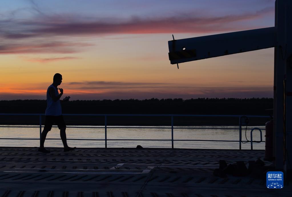 二副李行在傍晚結束工作后,來到最頂層貨艙平臺的開闊處鍛煉(8月10日攝)。看書、看電視、健身是船員們閑暇時放松的主要方式。