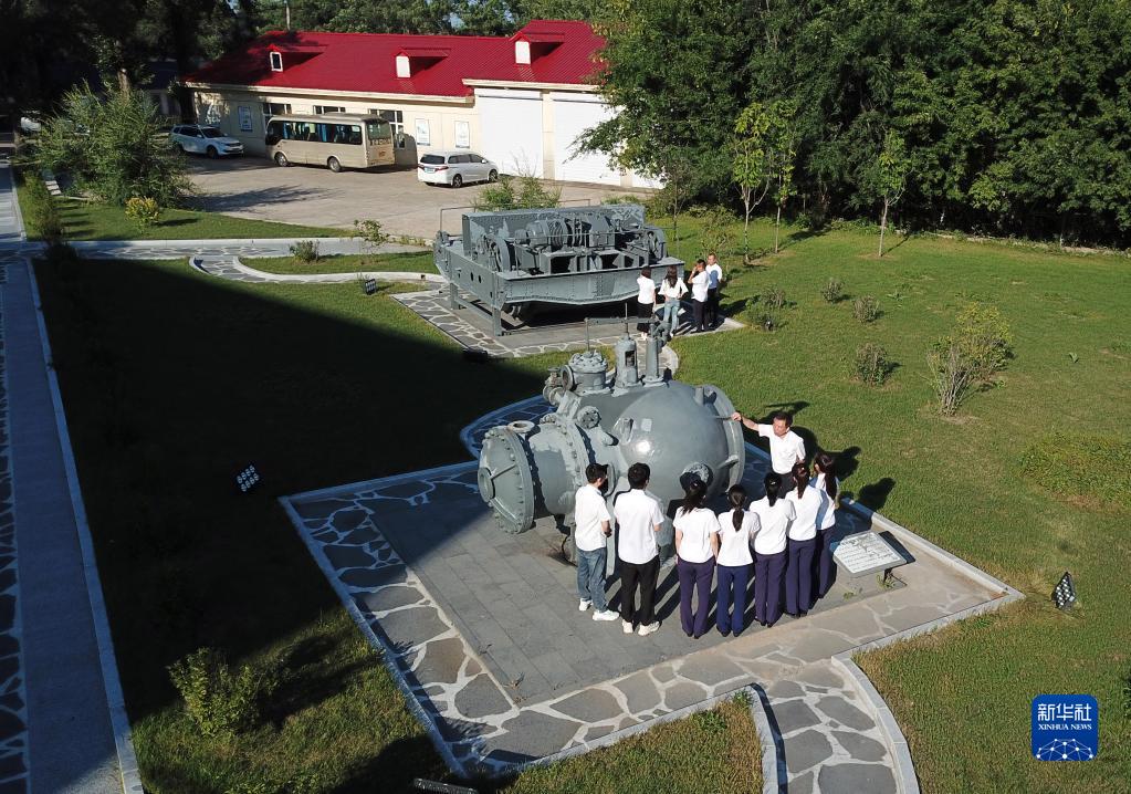 這是8月11日拍攝的參觀者在鏡泊湖發電廠的提戈公園參觀日偽時期的設備部件(無人機照片)。