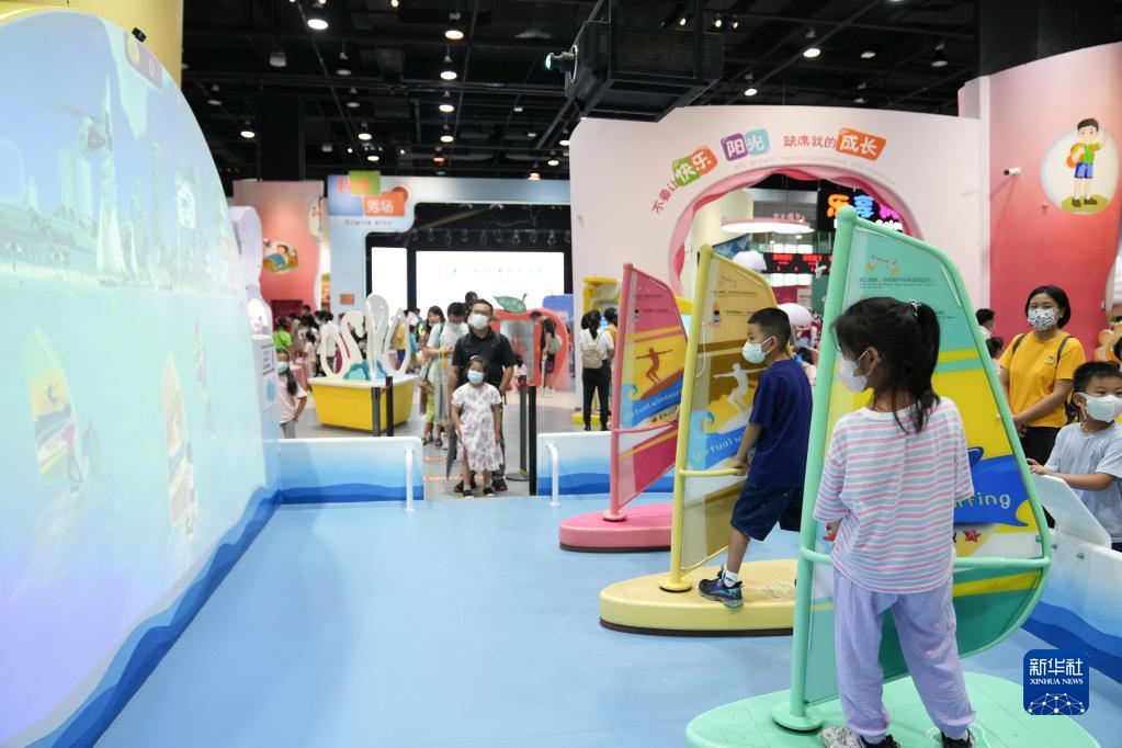 8月14日,在中國科學技術館,小朋友在體驗“虛擬帆板”裝置。