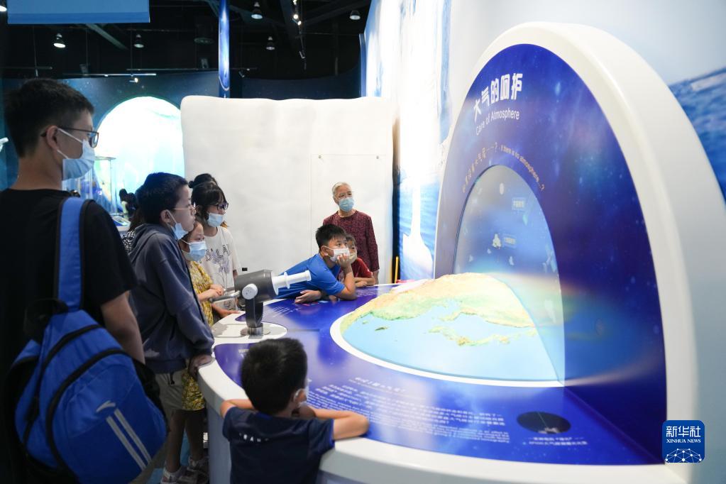 8月14日,在中國科學(xué)技術(shù)館,小朋友和家長在參觀名為“大氣的呵護(hù)”裝置。