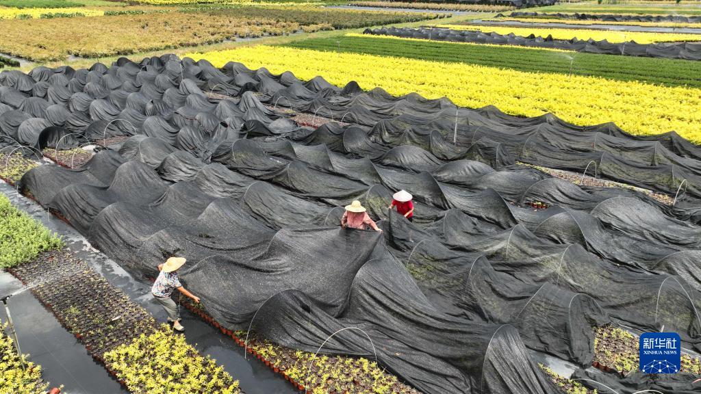 8月14日,在浙江省湖州市德清縣莫干山鎮高峰村苗木種植基地,工人給苗木覆蓋防曬網(無人機照片)。