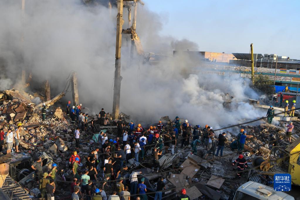 8月14日,救援人員在亞美尼亞首都埃里溫的購物中心爆炸現場工作。