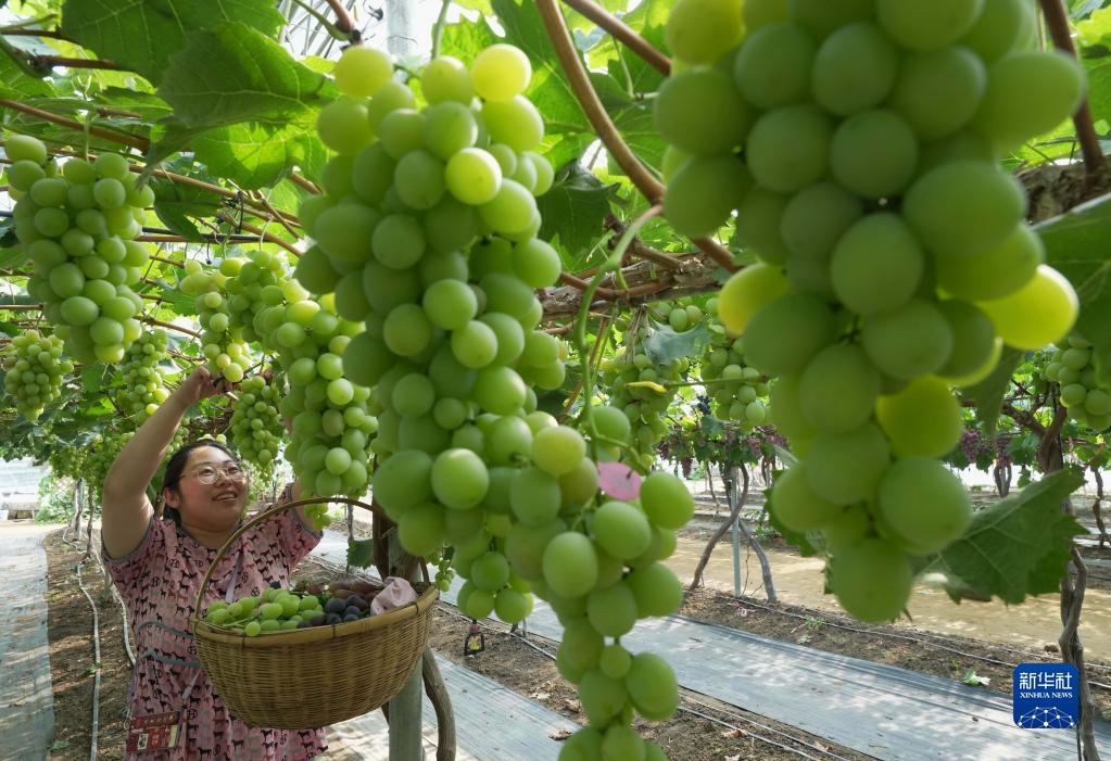 8月15日,盧龍縣蛤泊鎮鮑子溝村秦皇島綠佳家庭農場主邢艷麗在大棚內采摘葡萄。