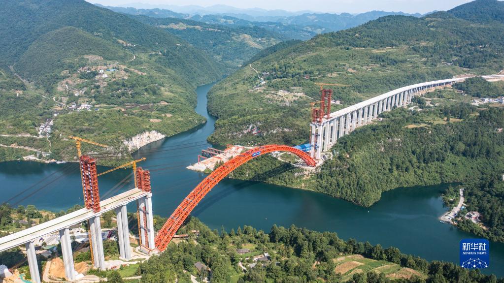 8月15日拍攝的德余高速烏江特大橋合龍現場(無人機照片)。