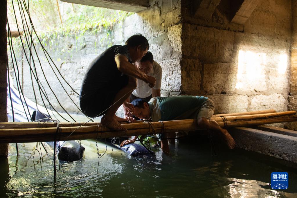 8月15日,在桃源縣熱市鎮郭家埡村,鄉鎮水利站工作人員在取水點安裝抽水設備。
