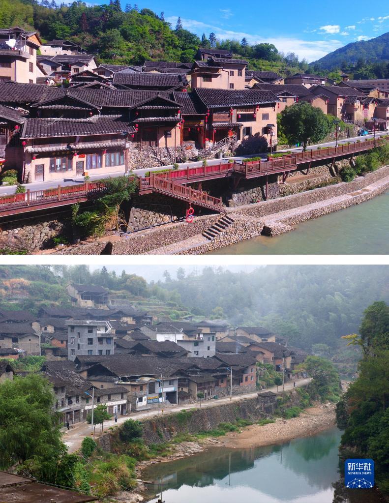 這是一張拼版照片。上圖為2022年6月23日拍攝的下黨村(無人機照片,新華社記者周義攝);下圖為2014年10月22日拍攝的下黨村(新華社記者姜克紅攝)。