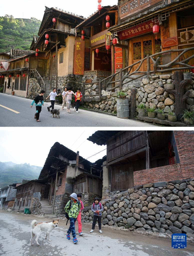 這是一張拼版照片。上圖為2022年6月23日拍攝的下黨村(新華社記者周義攝);下圖為2014年10月22日拍攝的下黨村(新華社記者姜克紅攝)。