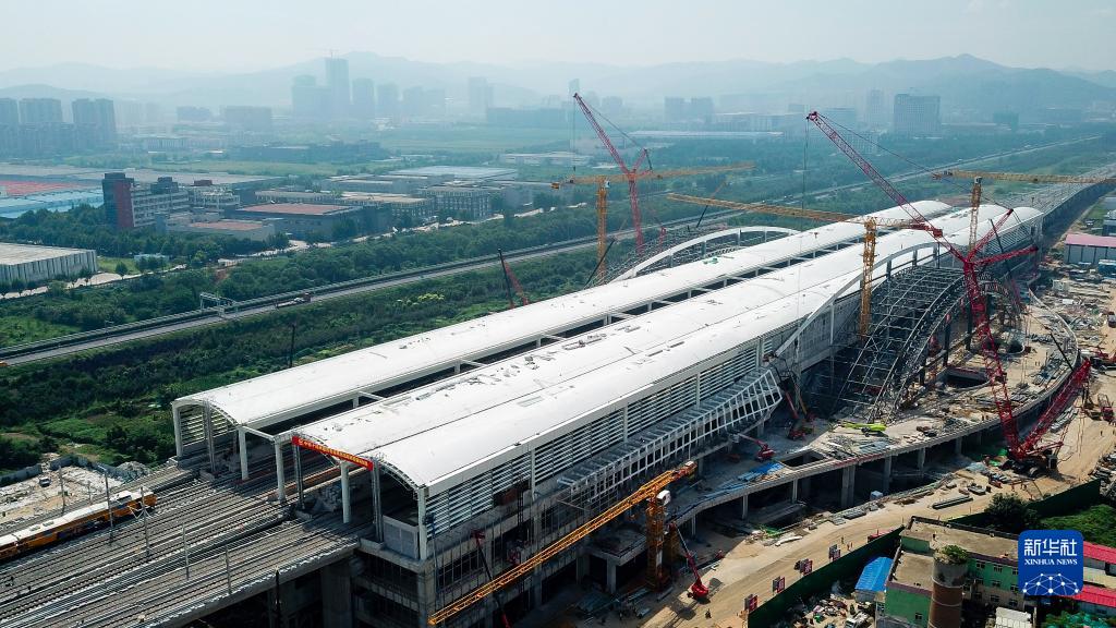 8月16日,在濟(jì)萊高鐵歷城站,施工人員在進(jìn)行站房和綜合配套工程施工作業(yè)(無人機(jī)照片)。